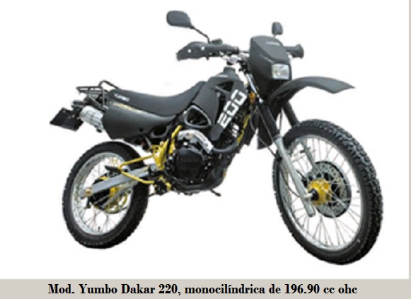 - Yumbo Dakar 220: 196.90 cc, 15.60 CV/8.350 rpm, arranque mixto, suspensión D/T telehidráulica / monoamortiguador, frenos D/T disco/tambor, tanque 6.5 L (reserva 1.5 L) y 122 kg de peso.