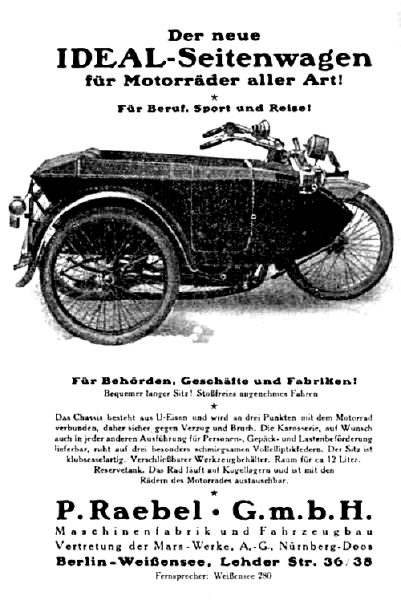 P. Raebel, fundador en 1922 de la "P. Raebel GmbH, Masschinenfabrik und Fahrzeugbau", con sede en la Lehder Straße 36-38, de {Weissensee}, Berlín, como una división de una agencia de venta de motocicletas MARS (Nürnberg), Vertretung der Mars - Werke AG., Nürnberg-Doos.