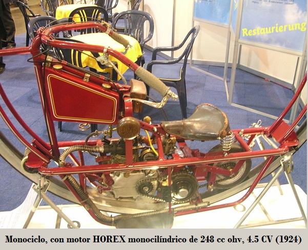 La "Horex Werke KG, Fahrzeugbau", con sede en Bad Homburg, estado de Hesse, fabricó en 1924 un monociclo, equipado con motor HOREX monocilíndrico vertical de 248 cc con distribución ohv de 4.5 CV y caja de cambios Burman pre-unit.