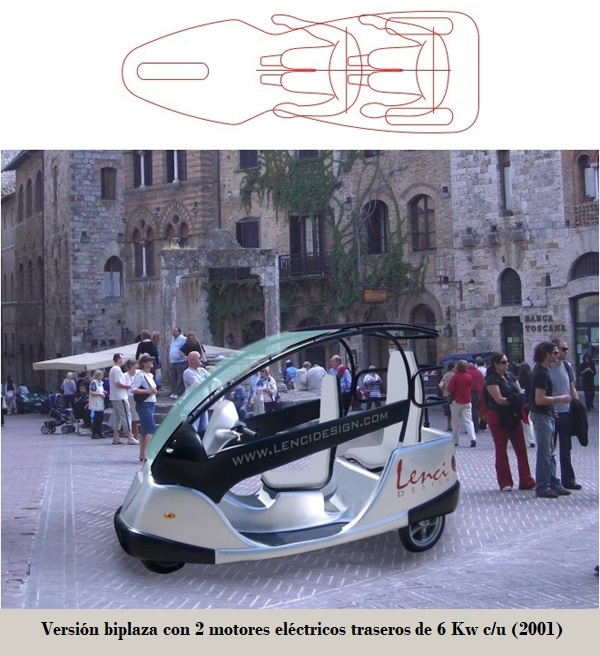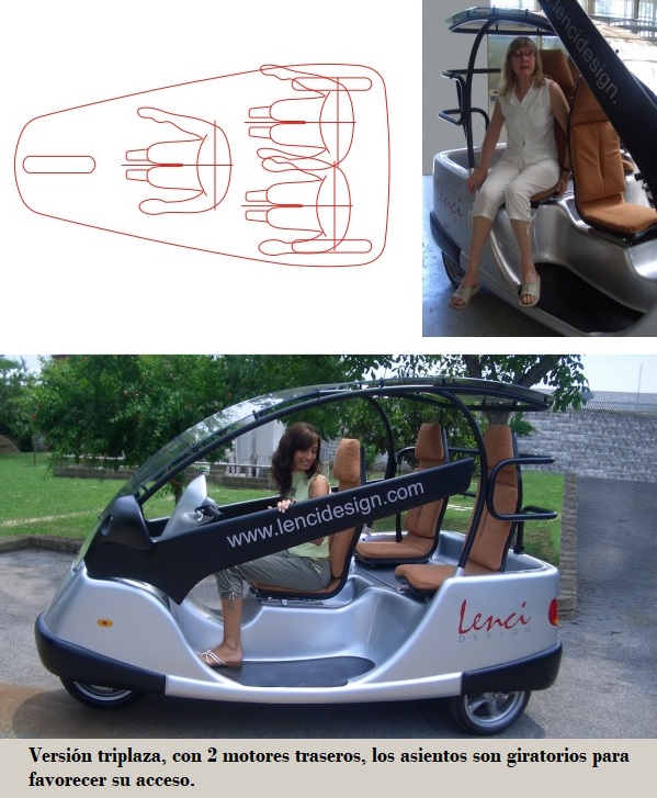 La versión de tres plazas se creo como vehículo taxi, con carrocería de vitroresina equipado con dos motores eléctricos montados a la parte trasera actuando sobre ambas ruedas. Sobre el techo transparente de policarbonato se montaba un sistema de células fotovoltaicas para el mantenimiento parcial del acumulador.