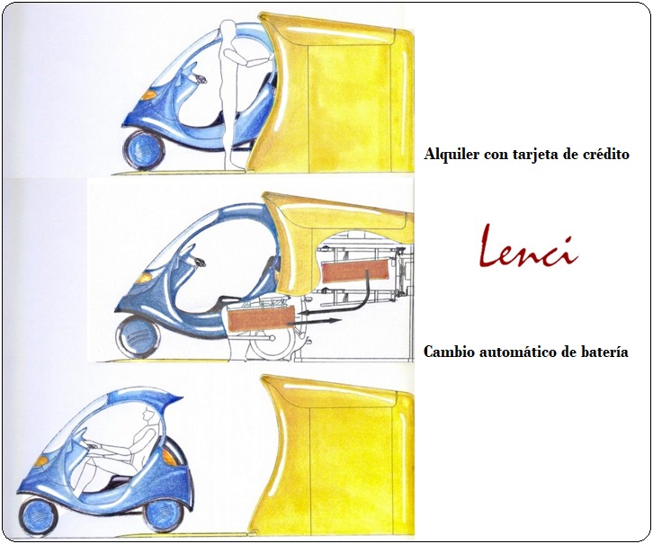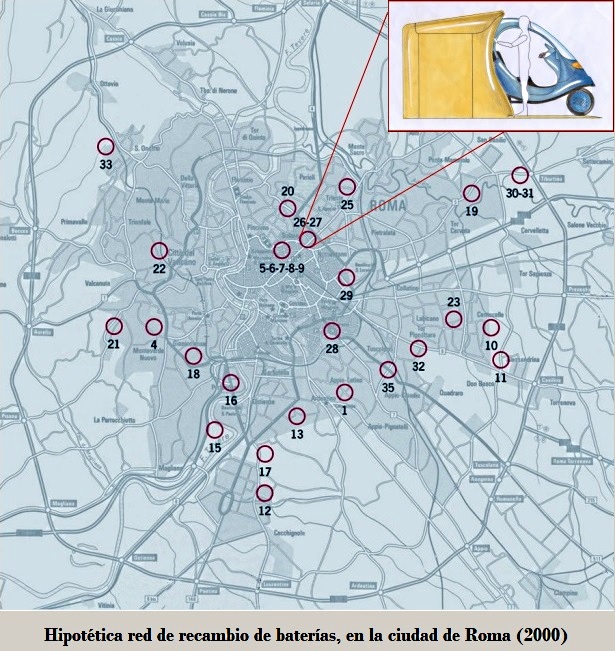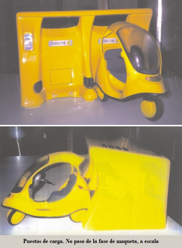 Los puestos callejeros de recarga, diseñados por la propia firma diseñadora, estarían ubicados en determinados lugares de la ciudad (ver foto efemérides) en módulos dobles es decir, un espacio de estacionamiento sería para dos vehículos, que permitirían el cambio automático y rápido de las baterías, siendo la recarga de estas últimas por el propio puesto.