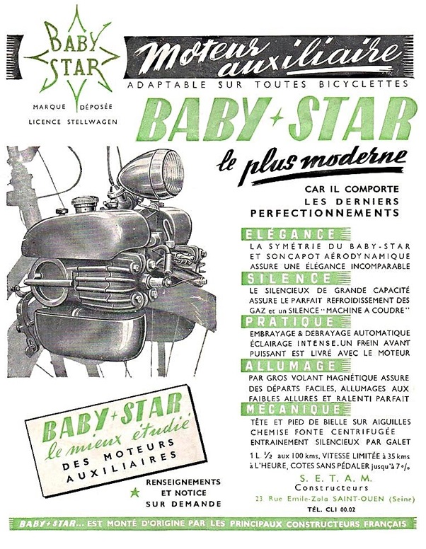 Lo presentó en el Salón de París de 1950 asegurando que podía montarse sobre la rueda delantera de cualquier bicicleta, siendo la transmisión a fricción por rodillo, pudiendo alcanzar velocidades máximas entre 32 y 35 km/h, con un consumo 1.5 L/100 km y una capacidad ascensional hasta del 7% (sin pedalear).