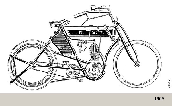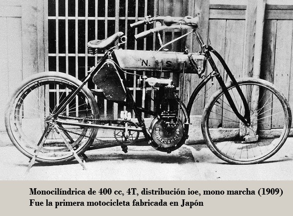 Narazo Shimazu con solo 21 años, en 1909 construyó a mano la motocicleta NS, incluyendo el motor, un monocilíndrico de 400 cc de 4T con distribución ioe, mono marcha, refrigerado por aire, bomba de aceite manual todo montado en el interior de un loop frame partiendo de un cuadro de bicicleta reformado, transmisión directa mediante correa a la rueda trasera, con un único freno trasero de zapata comandado desde el manillar, el caballete era de doble apoyo montado en la trasera; toda una gesta para la época.