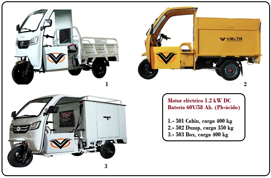 • 501 Cabin: motor 1.2 kW DC sin escobillas, batería (plomo-ácido) 60 V / 58 Ah, tiempo recarga 6-8 horas, frenos de tambor D/T, ruedas D/T 12 x 14" (con repuesto), velocidad máxima 30 km/h, autonomía 60 km, capacidad de carga 400 kg.