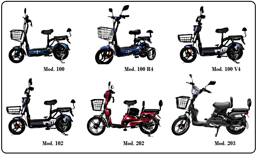 • 202: motor 500 W, batería 48 V / 12 Ah, ruedas D/T 2.50 x 16", velocidad máxima 40 km/h, autonomía 40 km, capacidad de carga 150 kg.