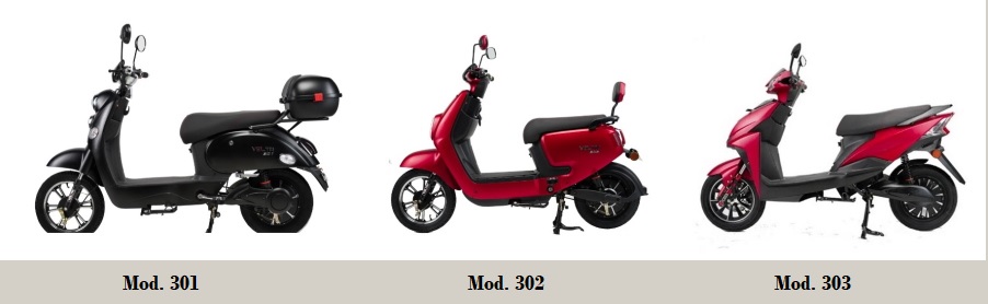 • 301: motor 650 W, batería 48 V / 12 Ah, ruedas D/T 2.50 x 16", velocidad máxima 40 km/h, autonomía 40 km, capacidad de carga 150 kg.