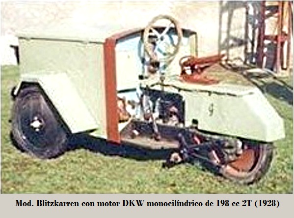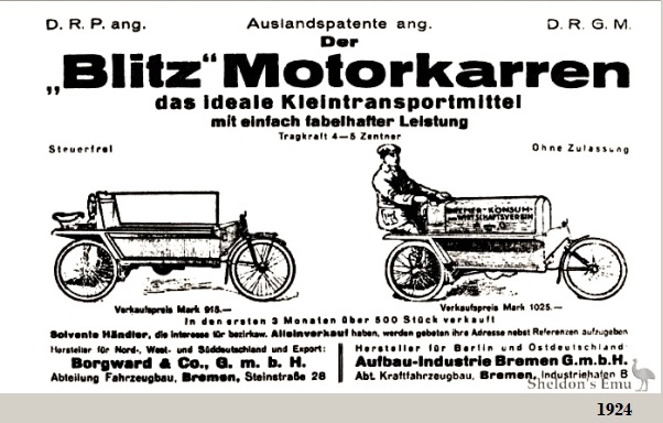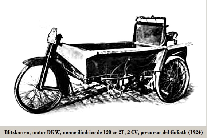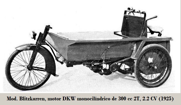 Ese año, los diseñadores Dietrich Klie y Friedrich (Fritz) Kynast, desarrollaron el llamado "Blitzkarren" ¹, un vehículo de 3 ruedas tipo delta para pequeño reparto, propulsado por un motor monocilíndrico DKW de 120 cc de 2T, de 2.0 CV, - con motor JLO en 1925 - transmisión directa mediante correa a la rueda trasera izquierda.