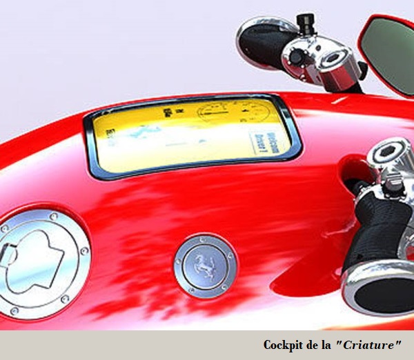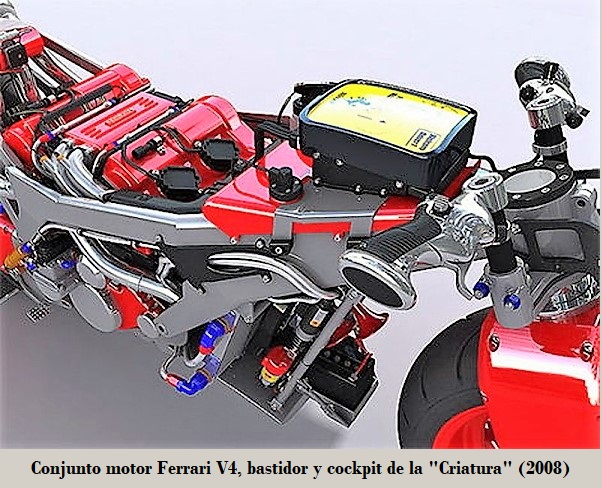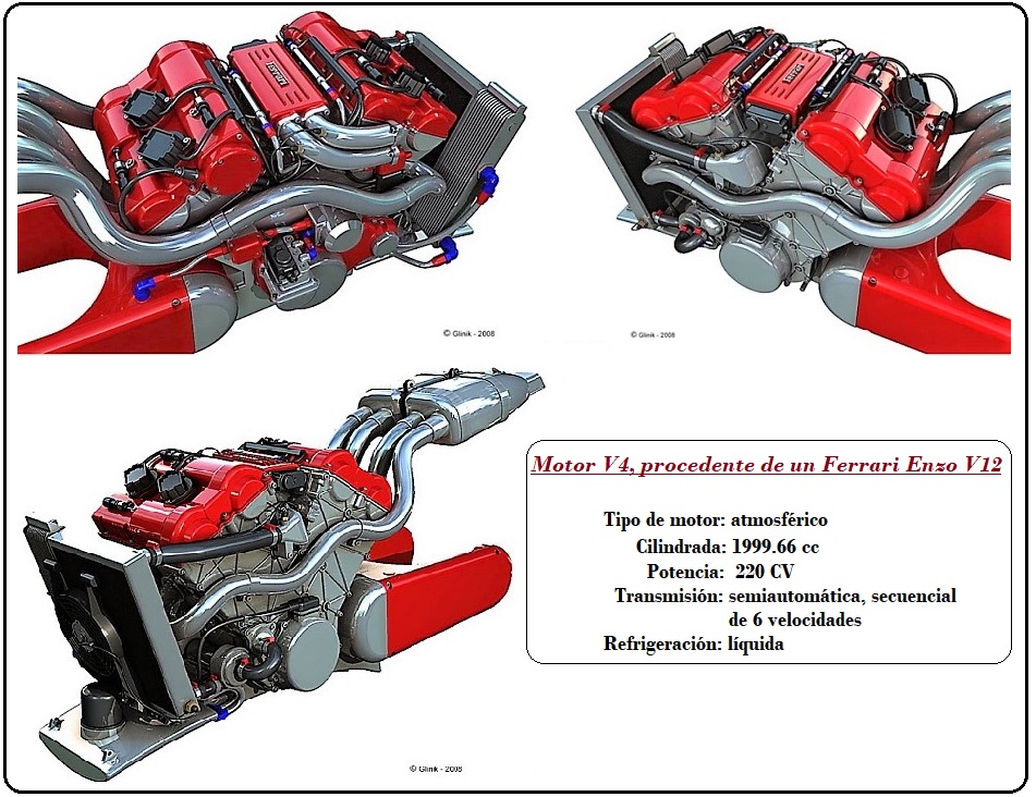 A diferencia de la anterior MOTOCICLETA FERRARI (Varese), esta sí que equipaba un motor procedente de un Ferrari Enzo V12, al que se "cortó" como un V4, para poder ser instalado en el cuadro.