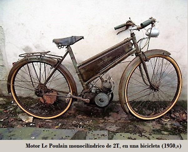 Basado en un bicicleta de cuadro abierto, equipado con motor LE POULAIN suspendido bajo el tanque tipo stecktank, cuadro abierto, frenos de llanta} D/T...
