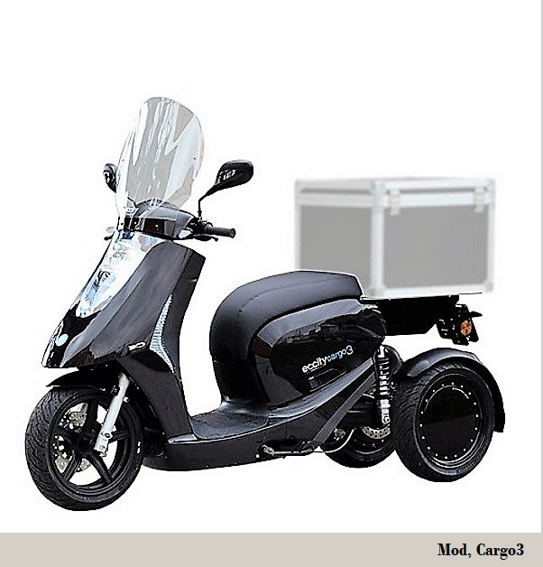 - Cargo3: monoplaza, motor de 10 a 13.2 kW montados en cada una de las ruedas traseras), batería Li-on de 75.6 V / 6.5 kW/h (recarga en 3 h con toma de 230 V), autonomía 100 km, velocidad máxima 110 km/h, neumáticos Michelin de 13" batalla 1260 mm.