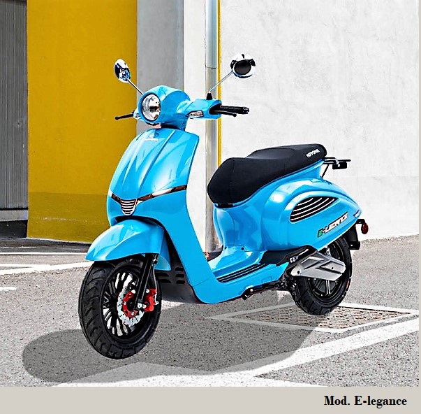 - E-Legance: biplaza, motor Bosch de 3.0 kW, batería Li-on de 60 V / 52 Ah (recarga de 6-8 h con toma de 230 V), frenos de disco D/T, autonomía 54 km (110 km con 2 baterías), batalla 1155 mm y 87 kg