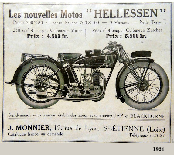 Las motocicletas Hellessen estuvieron en producción desde 1924 hasta 1933 y fueron vendidas por MONNIER bajo este nombre de marca.