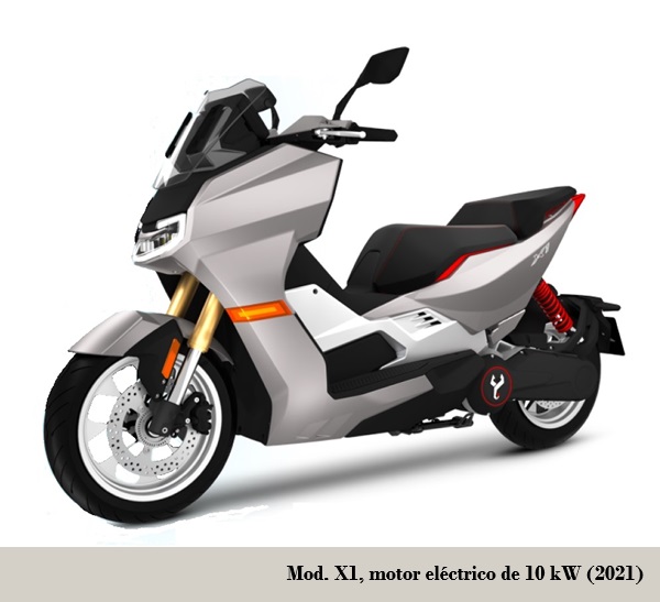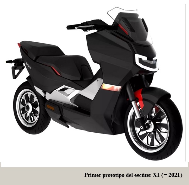 Características del X1 del escúter / maxiescúter: motor eléctrico central de 10 kW de potencia, batería no extraíble, transmisión mediante cadena a la rueda trasera, suspensión D/T {horquilla telescópica invertida} / basculante monobrazo con monoshock, frenos de disco D/T, autonomía de 200 km y alcanzando los 105 km/h.