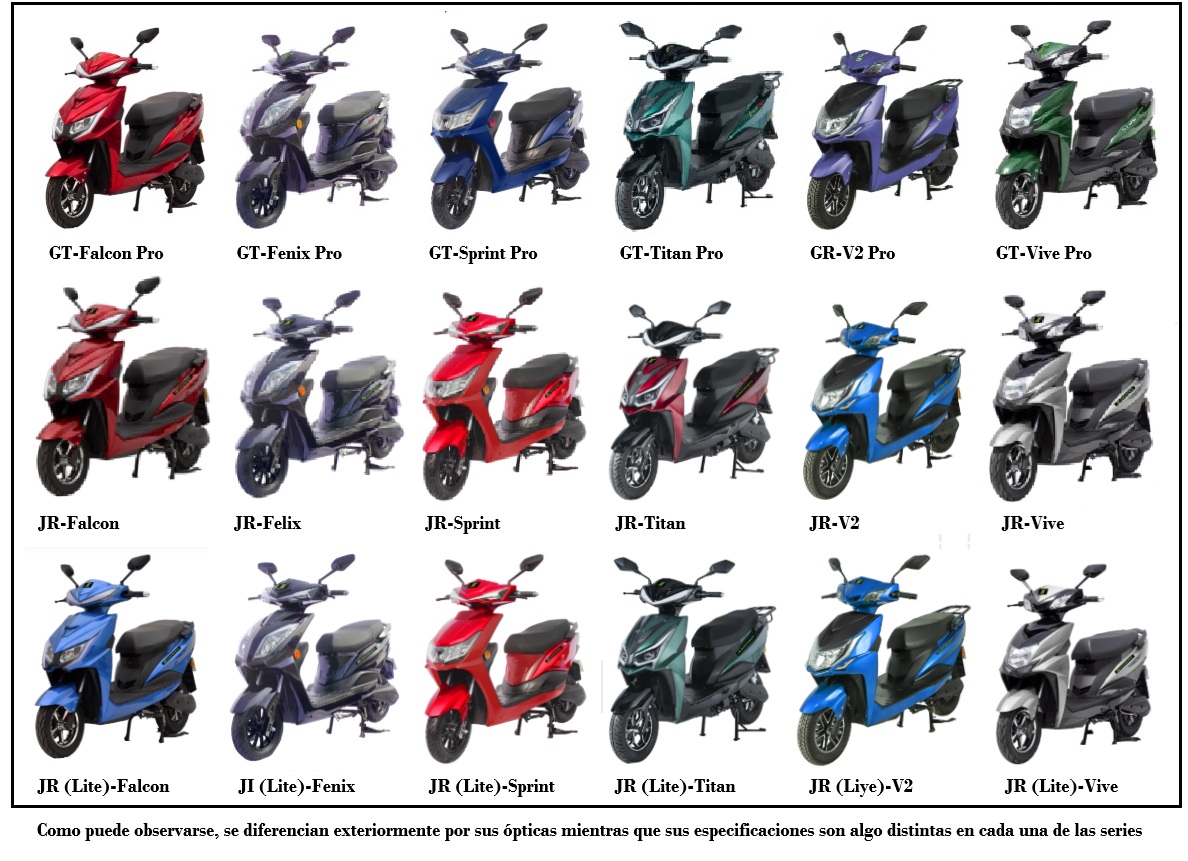 Serie GT, además de lo básico todos tienen en común lo siguiente: batería de 60 V / 1.5 kW/h, autonomía 70-80 km, salvo las excepciones que se citan: