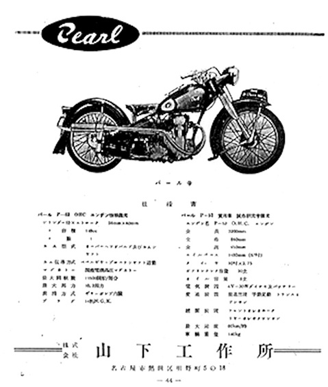 Ikushi Yamashita, fundó en 1947 la “ Yamashita Workshop”, con fábrica ubicada en el 297-1, Kamihama-cho, barrio Minami-ku, en la ciudad de Nagoya capital de la prefectura de Aichi, dedicada a la fabricación de motocicletas de competición bajo el nombre de Pearl (パール号).