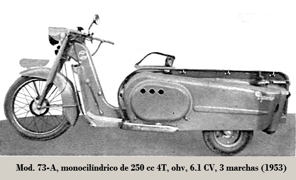 • Mod. T73A: de 200 cc , distribución ohv, 6.1 CV, bastidor abierto monocasco de acero estampado, batalla 2.071 mm, capacidad ascensional del 14 %, velocidad máxima 48 km/h y ~ 158 kg. 1953