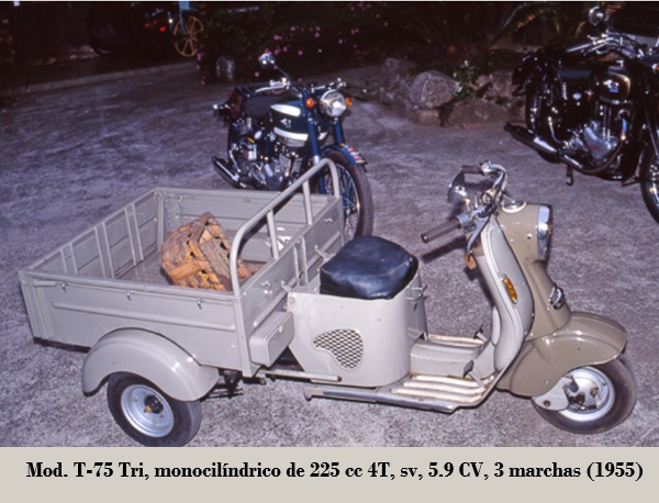 • Mod. T75 Tri: basado en un escúter, de 225 cc, distribución sv, 5.9 CV, con llantas de disco y de menor tamaño que las del anterior. 1954