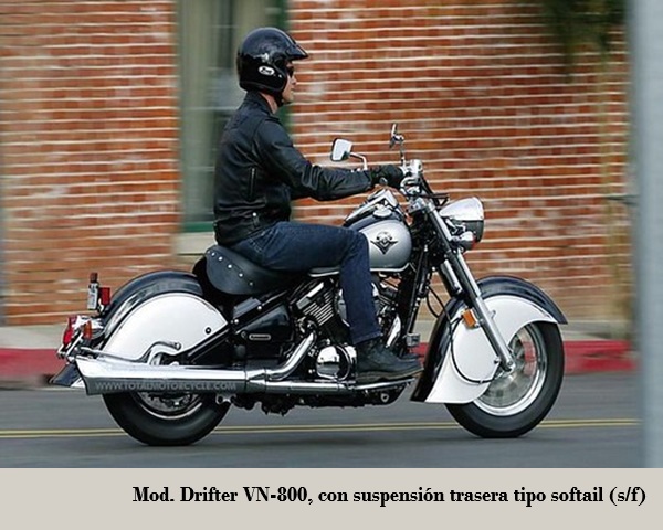 Muy poco después lanzaron la VN-800, con suspensión trasera Softail, sin la electrónica de su hermana mayor y alimentada por carburador y con tan solo 7 CV menos...