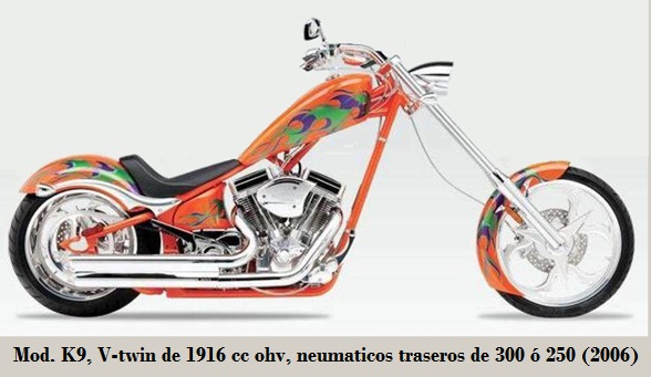 - K9 300 / 250: según neumático trasero Super Fat 300 / 250, de 1916 cc, suspensión trasera tipo Softail, lanzamiento 42º, tanque 19.9 / 16 L y 318 /303 kg. 2006-2011. En 2006 fue el modelo que alcanzó la cifra 20.000 desde su inicio