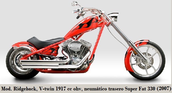 - Ridgeback: neumático trasero Super Fat 330, suspensión trasera tipo softail, tanque 18.16 L, 308 kg. 2007-2008