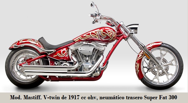 - Mastiff: neumático trasero Super Fat 300, lanzamiento 42º, suspensión trasera tipo Softail y 321 kg. 2008-2011