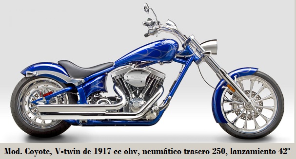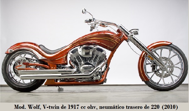 - Wolf: 1976 cc a 56º, compresión 9.9:1, carburador Clefi, neumático trasero 220 - 20", suspensión trasera tipo Softail, tanque 17 L y 349 kg. 2009-2111.