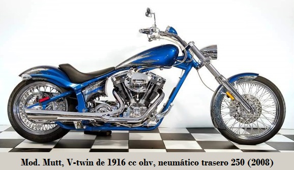 - Mutt: compresión 9.6:1, suspensión trasera Softail. transmisión por correa, tanque 16.7 L, neumáticos D/T 90 - 21"/250 - 18", 321 kg. 2007-2008. Muy similar a la Coyote,