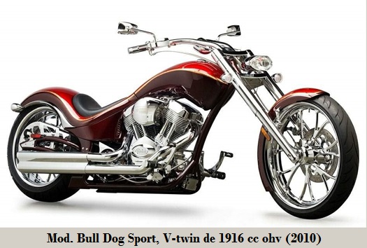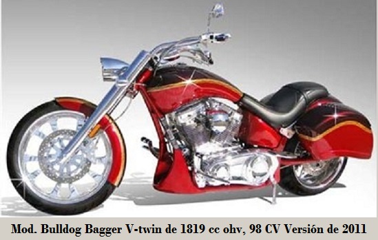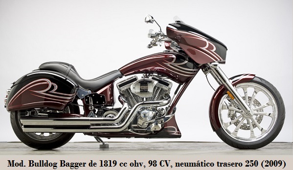 - Bull Dog Bagger: de 1819 cc, 98 CV/5 800 rpm, transmisión final por correa, neumáticos D/T 120 - 70-21"/250 - 40-18", tanque 20 L y 352 kg. 2009-2010